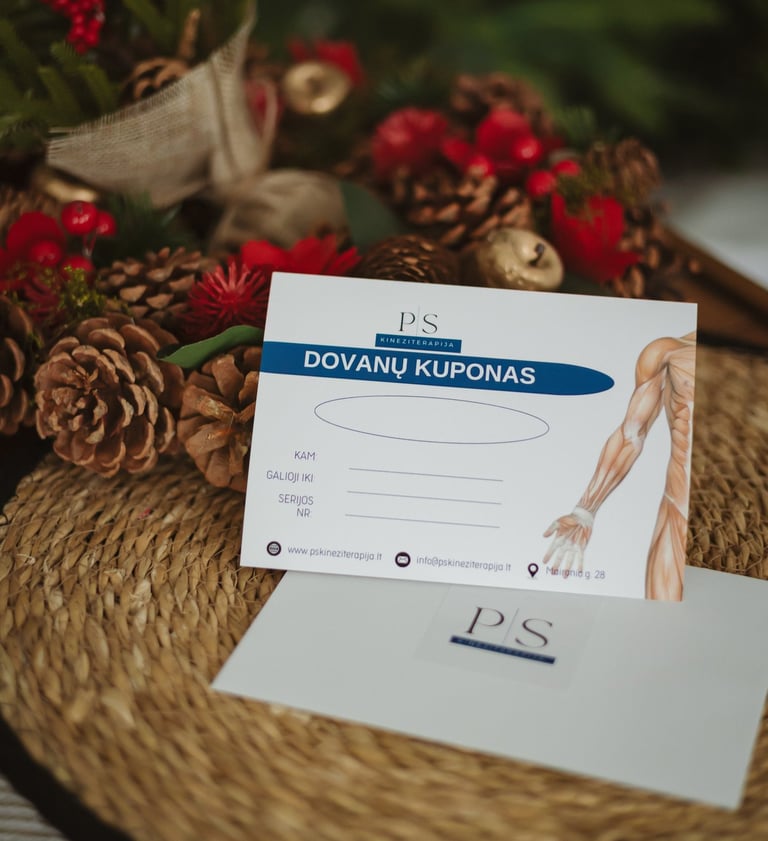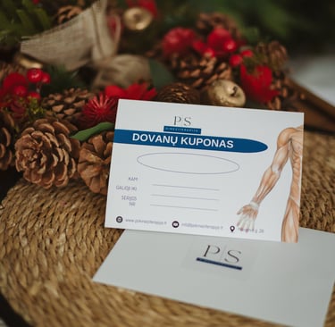 "PS Kineziterapija" dovanų kuponas, kurį galite panaudoti kineziterapijos paslaugoms, masažams ir fizioterapijai.